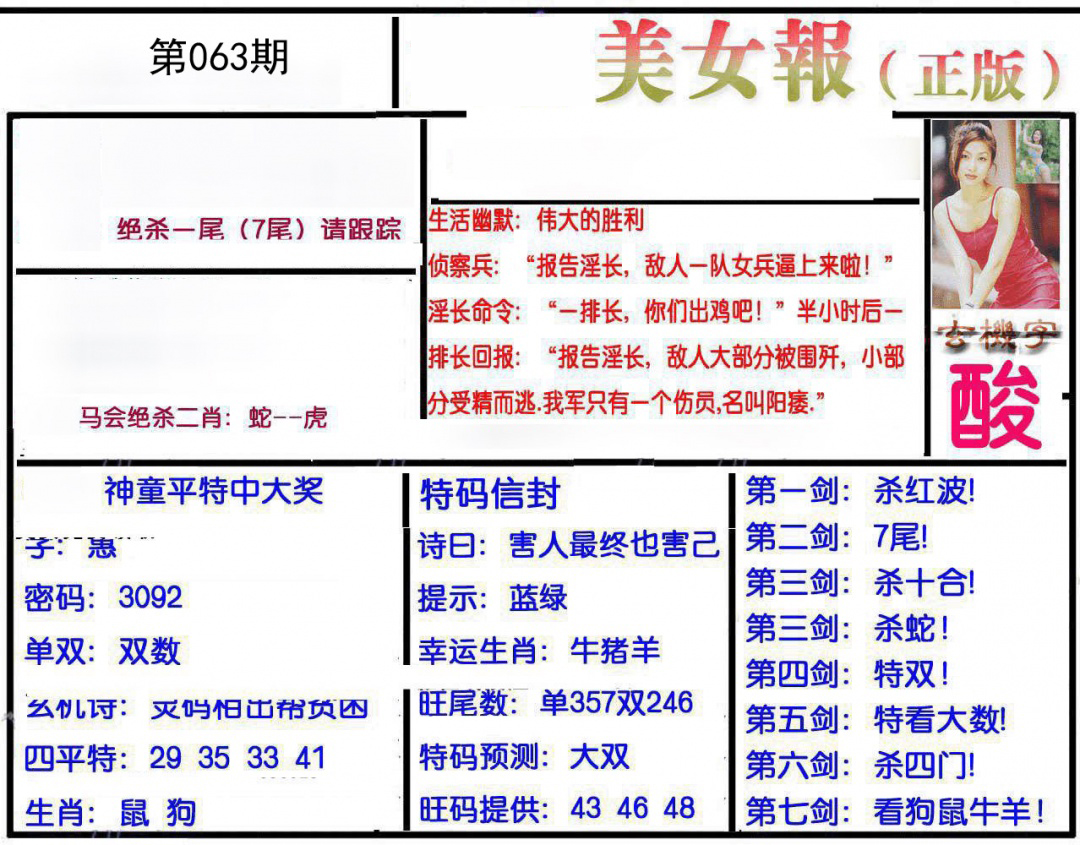 | 058期: | 平特二肖-->猪牛 | 羊36 |